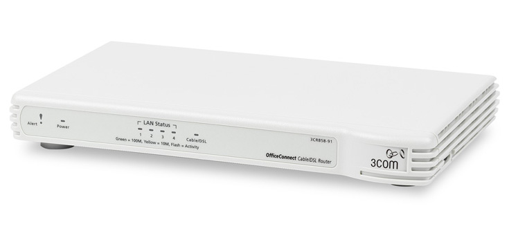 The 3Com OfficeConnect Cable/DSL Secure Router lets small offices, branch-offices, and home offices benefit from reliable and cost-effective shared Internet access. Up to 253 users can securely share a single cable or DSL connection. The router offers a four-port 10/100 Ethernet LAN switch, plus an Ethernet WAN port for connecting to a broadband modem (not included). Multiple security features, including Stateful Packet Inspection firewall, VPN initiation/termination and passthrough support, provide high level of protection at affordable price. The unit comes with preset defaults, setup wizards, and other features that simplify installation, configuration, and administration.